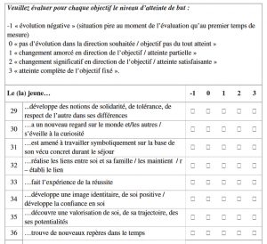 Qu’il s’agisse d’objectifs éducatifs généraux (il s’agit d’objectifs éducatifs qui se retrouvent de façon récurrente dans les projets francophones et qui ont trait au vécu ou aux acquis des jeunes), d’objectifs intrinsèques aux séjours (il s’agit d’objectifs qui ont trait à la nature même des séjours, en adressant par exemple les notions de « distance » ou certaines activités propres aux séjours), ou d’objectifs spécifiques (il s’agit d’objectifs individualisés qui sont formulés de cas en cas, par le jeune lui-même, la famille, les mandataires, l’équipe éducative d’origine), pour tous ces objectifs, il s’agit d’évaluer le degré auquel le/la jeune atteint un objectif donné à un moment déterminé, par rapport à un niveau « zéro » qui représente la situation du jeune au moment de l’arrivée.